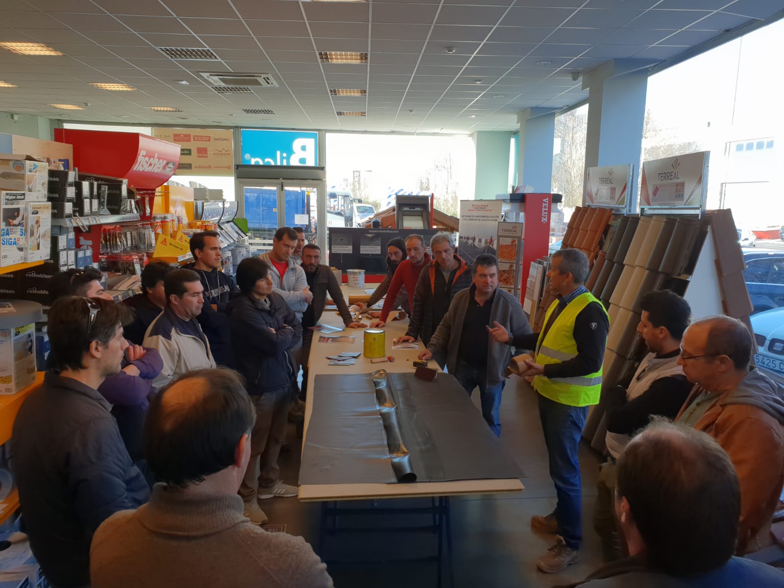 Como otro año mas hemos realizado el curso practico sobre sistemas de impermeabilización EPDM en nuestras instalaciones. A continuación detallamos parte de la formación. La impermeabilización mediante láminas de caucho EPDM parte de la fabricación de láminas compuestas por una estructura de polímero reticulado que proporciona resultados excelentes incluso en los entornos más exigentes a intemperie. Son láminas impermeables autoprotegidas. Se engloba entre las láminas sintéticas monocapa. Otra característica de las láminas EPDM es su durabilidad con expectativa de vida estimada en 50 años, de los cuales Firestone garantiza 20 años, incluso a intemperie. No solo es un buen material, Firestone también dispone de un sistema de instalación certificado por DIT (Documento de Idoneidad Técnica) expedido por el Instituto de Ciencias de la Construcción Eduardo Torroja, AVIS TECHNIQUE expedido por CSTB y otros certificados. El mejor de los materiales sin un sistema de instalación está llamado al fracaso durante su puesta en obra.