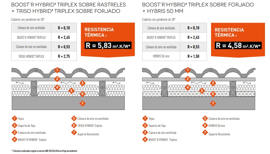El aislamiento térmico Boost’r Hybrid’s tiene una resistencia térmica intrínseca (sin cámara) de 2,45 m2 .K/W que puede alcanzar 3,45 m2.K/W según UNE EN 16012 con 2 cámaras de aire de 20 mm. BOOST’R HYBRID puede colocarse también sin cámara de aire o con 1 sola.
