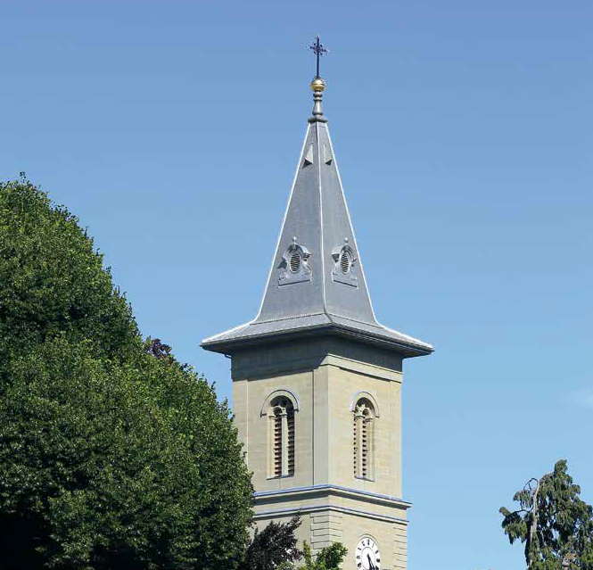 · El campanario restaurado protege este edificio catalogado, con escalas personalizadas y ventanas de ojo de buey ejecutadas por el metalúrgico ornamental regional