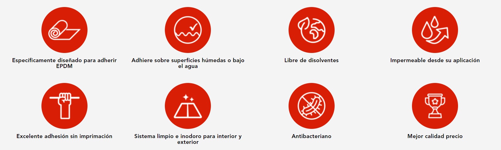 Está diseñado para sistemas de impermeabilización Rollgum EPDM y apto para otros, con excelente adhesión entre láminas y sobre diferentes soportes.