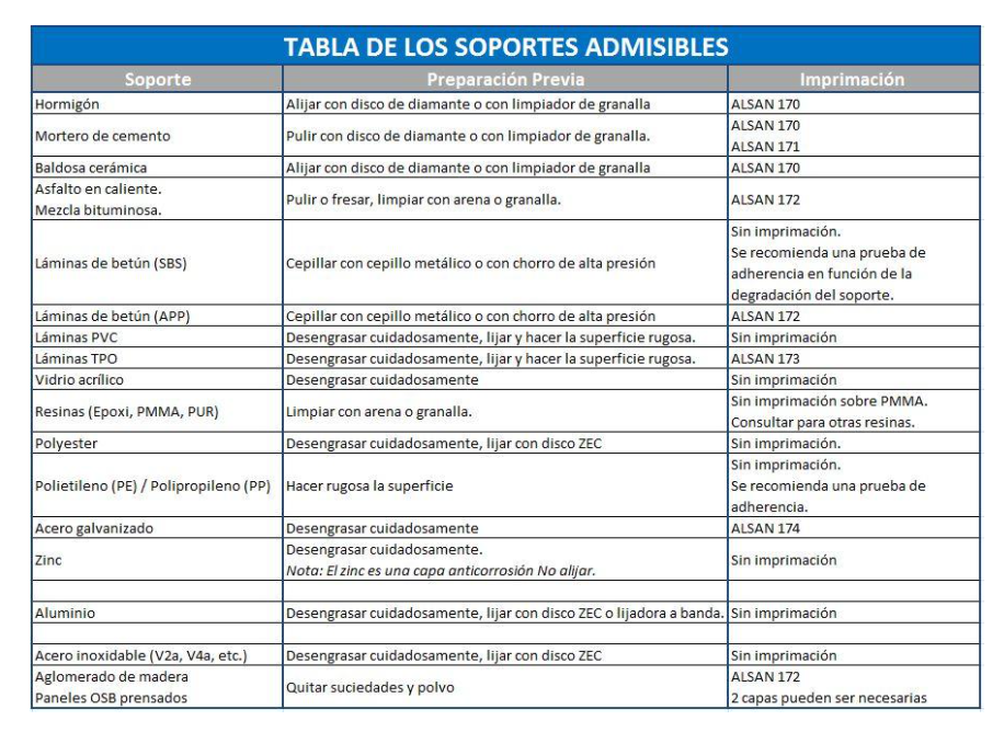 Sobre superficies plásticas como el PVC y el TPO, el desarrollo de la membrana líquida de PMMA de Soprema, ALSAN 770 TX, con un alto nivel tixotrópico, y una imprimación previa según el tipo de soporte (ver tabla), permite solucionar de la misma manera cualquier detalle de una cubierta.