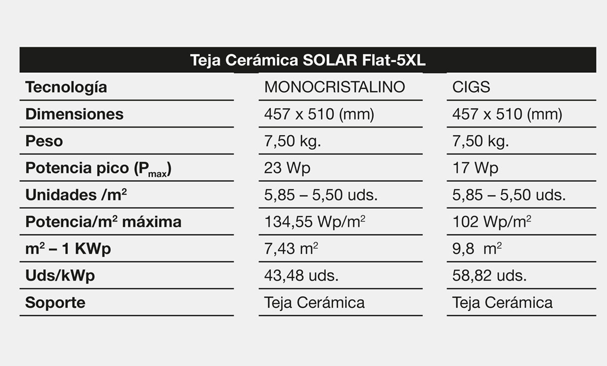 La teja cerámica SOLAR FLAT-5XL se presenta en dos versiones de captación de energía solar, empleando distintas tecnologías de paneles fotovoltaicos, para adaptarse a las necesidades de generación de energía y a la disponibilidad de espacio de cada proyecto: monocristalino y CIGS.