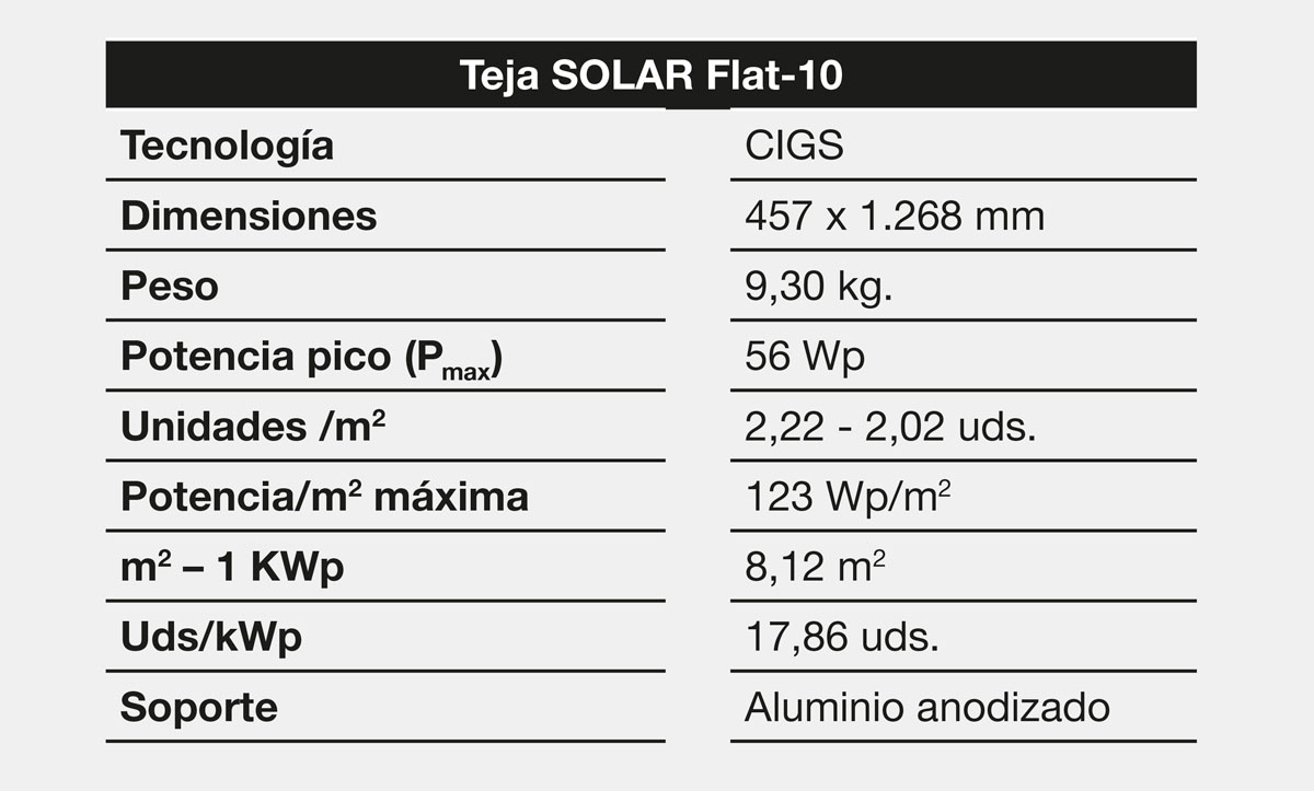 Como segunda opción en la gama solar de Tejas Borja, se incluye un formato compatible con el otro modelo de teja cerámica plana, la Flat-10. La teja SOLAR FLAT-10 equivale a 5 tejas cerámicas del modelo homónimo e incorpora la tecnología CIGS en cuanto al panel fotovoltaico.