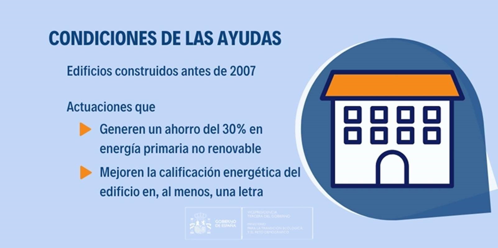 Estos edificios deben haberse construido antes de 2007 y tendrán que ahorrar un 30% de energía primaria no renovable, y su calificación energética total debe aumentarse en al menos una letra en comparación con la calificación inicial.
