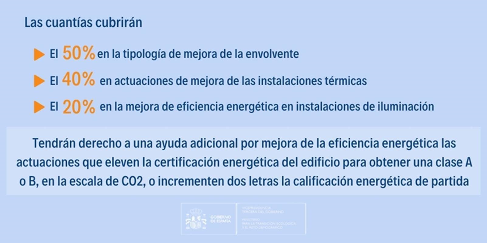 Así mismo, tendrán derecho a una ayuda adicional por mejora de la eficiencia energética aquellas actuaciones que eleven la calificación energética del edificio para obtener una clase energética A o B, en la escala de CO2, o bien incrementen en dos letras la calificación energética de partida.