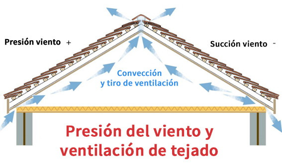 En una cubierta ventilada, estas fuerzas actúan como una ventilación doble, de nivel bajo (por los aleros) y de nivel alto (por la cumbrera), formando la convección o ventilación dentro del espacio de la cubierta, que en circunstancias normales expulsará el vapor de agua del interior del espacio del techo y evitará la formación de condensaciones.