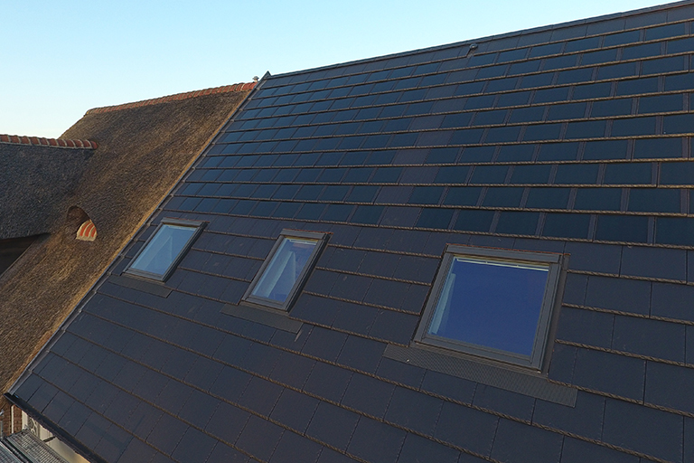 Las tejas solares, al igual que otros productos de captación solar (ej. paneles solares), captan energía lumínica del sol durante el día y la convierte en corriente continua. Habitualmente en una casa o edificio se utiliza corriente alterna. Mediante la instalación de energía solar, una vez que pasa por el inversor, la corriente continua se transforma en corriente alterna aprovechable. En este punto, la electricidad se puede utilizar y consumir, o ceder/vender a la red de distribución eléctrica. También existe la posibilidad en disponer de baterías conectadas y almacenar el exceso de energía producido durante el día para su consumo en momentos sin sol.