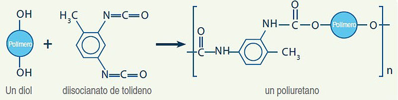 Este tipo de productos contienen sustancias de escaso poder cancerígeno que, si representan algún peligro, sólo sería tras exposiciones intensas y teniendo contacto directo. Se forma básicamente por la reacción química de dos compuestos, un poliol y un isocianato, aunque su formulación necesita y admite múltiples variantes y aditivos. Dicha reacción libera dióxido de carbono, gas que es el responsable de la formación de las burbujas.