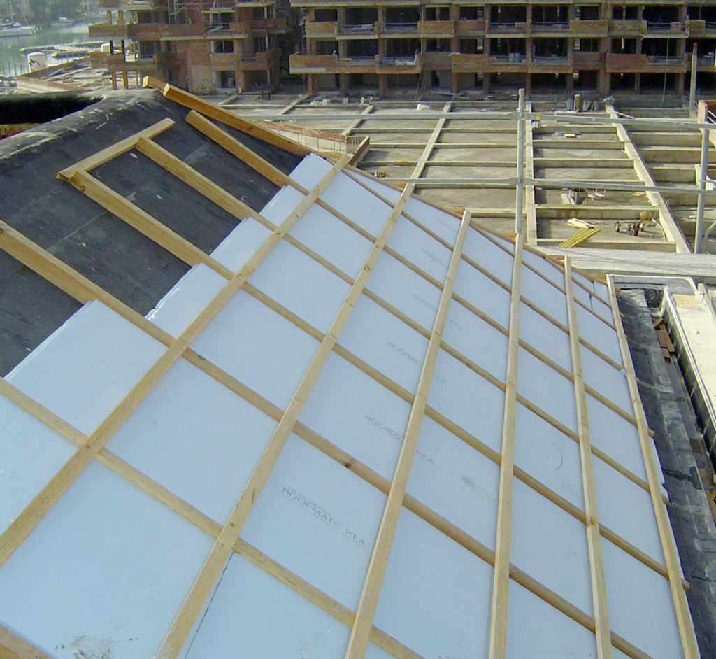 La cubierta inclinada es muy usada en zonas con alta pluviometría, factores como el entorno, la influencia etnográfica o sabiduría local y las normativas dirigen al uso de este tipo de cubierta. El uso del EPDM se suele encasillar, erróneamente, en cubiertas planas cuando lo cierto es que también se aplica con éxito en cubiertas inclinadas por toda nuestra geografía. La gran ventaja que aporta la cubierta inclinada es la velocidad de escorrentía del agua de lluvia, mayor cuanto mayor sea la inclinación. Otra ventaja es la imposibilidad de que se formen retenciones de agua en la cubierta. Su geometría ahorra compromisos a la impermeabilización ya que en muchos casos el agua no llega a ponerla a prueba.