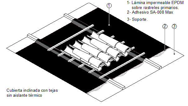 En la elección de los materiales el factor “durabilidad” es muy importante, las cubiertas inclinadas son especialmente difíciles de reparar por su altura y accesibilidad. Las patologías que se pueden producir son especialmente traumáticas ya que implican la presencia indeseada de agua (filtraciones en forma de goteras o manchas) con la consiguiente pérdida de confort y compromisos de salubridad. También puede darse la pérdida de aislamiento por la degradación del mismo (capacidad de encapsular aire). Un mayor ciclo de vida útil de los materiales que conforman la cubierta puede hacer que las reparaciones o renovaciones sean menos durante la historia del inmueble. Esto supone un importante ahorro económico y también energético en emisiones de C02 al evitar volver a fabricar materiales para cubrir una misma necesidad. En este tipo de impermeabilización de cubiertas con láminas sintéticas EPDM se utilizan sistemas de fijación mecánica no perforante RMA, que consiguen una fijación mecánica de la membrana sin perforarla. Al no necesitar de solapes que preserven las fijaciones mecánicas se consigue un esfuerzo simétrico frente a la succión por viento. Al no perforar las láminas se evita la posibilidad de desgarro. PROVEEDOR