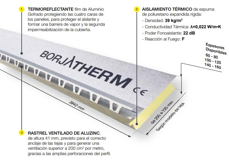 Máxima Eficiencia en Cubierta Inclinada Borjatherm El sistema SAT de Tejas Borja es una solución completa de aislamientos térmicos por el exterior para cubierta inclinada, este sistema está creado para usar tanto en rehabilitación como para obras nuevas. Los paneles Borjatherm reúne las funciones de 6 productos en 1 por lo que no son necesarios los materiales que hasta a día de hoy eran primordiales para construir una cubierta inclinada aislada y ventilada. Estos paneles están compuestos por un núcleo de poliuretano envuelto con un Film de Aluminio de Alu-Zinc para el empleo de las tejas o placas.